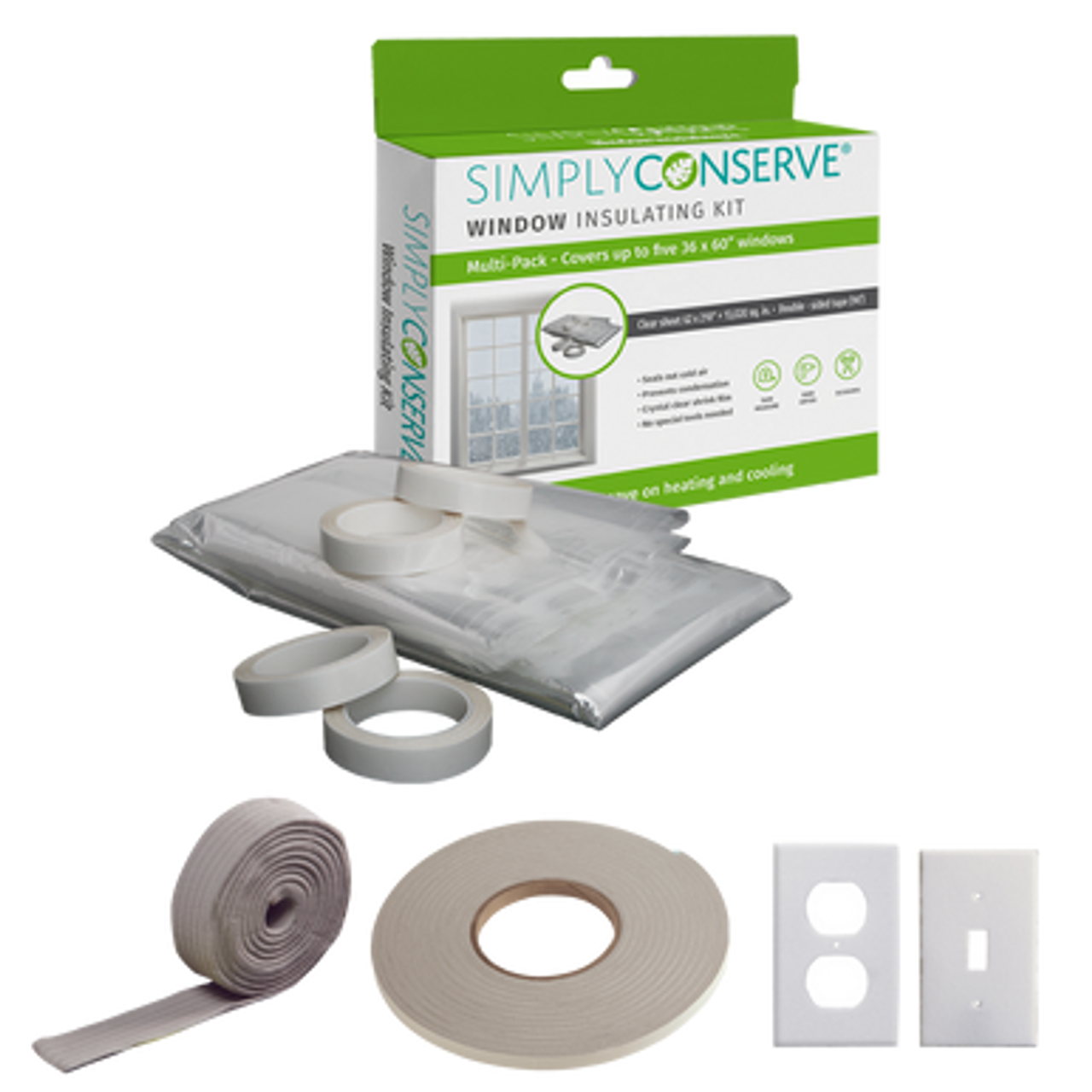 THE DIY WEATHERIZATION KIT INCLUDES A DELUXE WINDOW INSULATION KIT, FINGERTIP ROPE CAULK, CLOSED CELL FOAM TAPE WEATHERSTRIPPING, AND SWITCH AND OUTLET SEALING GASKETS.
